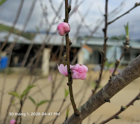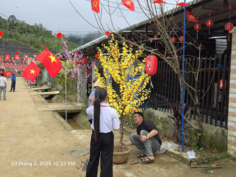 Những chậu mai vàng, đào hồng được chăm chút cẩn thận; những lá cờ được treo ngay ngắn bên hiên nhà. Hình ảnh người lớn chỉnh lại cành hoa, trẻ nhỏ chạy chơi trên con đường làng rực rỡ sắc xuân đã tạo nên một bức tranh sinh động, thể hiện tinh thần đoàn kết, niềm vui đón Tết của người dân vùng cao sơn cước.