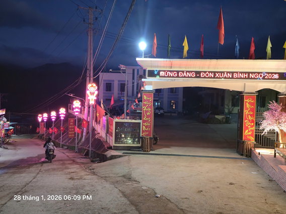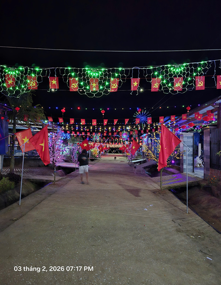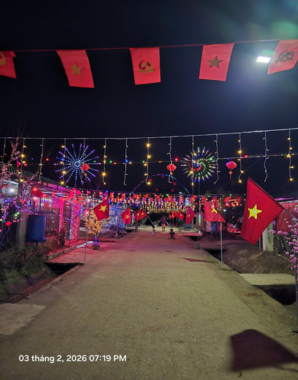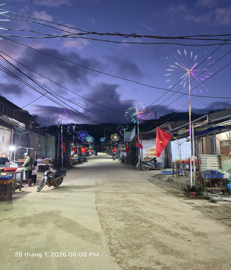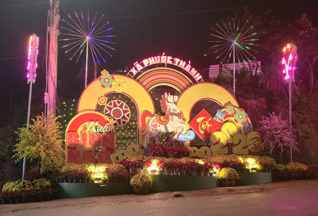 Khi màn đêm buông xuống, những con đường làng vốn quen thuộc bỗng trở nên lung linh hơn. Ánh đèn led, đèn trang trí kết hợp cùng cờ hoa, lồng đèn đỏ thắp sáng cả không gian, mang đến cảm giác bình yên, ấm cúng – một nét xuân rất riêng của vùng cao Phước Thành.